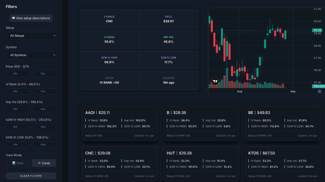 Con tu membresía obtienes acceso a AlphaRadar, el escáner privado de MG Alpha, creado para simplificar la búsqueda de oportunidades de trading: direccionales, puts, covered calls y más.